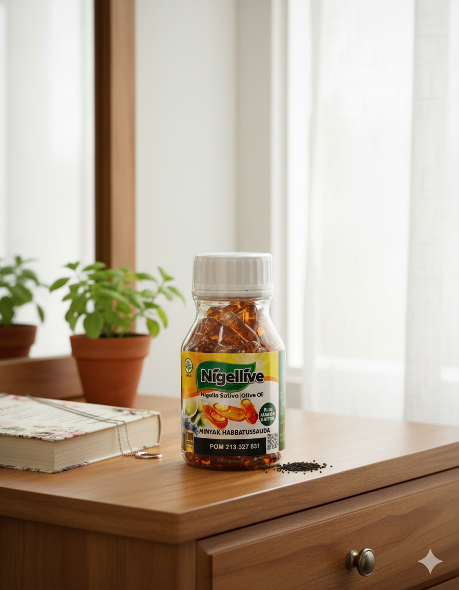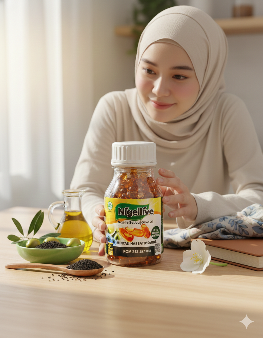 Suplemen dahsyat dalam Nigellive yang mengandung didalam satu kapsulnya campuran minyak zaitun dengan minyak habbatussauda.